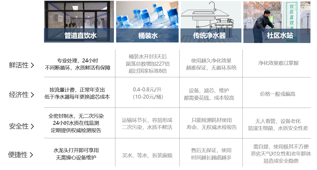 雖然目前管道直飲水還處于起步階段,但與包裝水、小區飲水站、家用凈水器等這些傳統的飲水方式相比,管道直飲水入戶有著明顯的優勢。