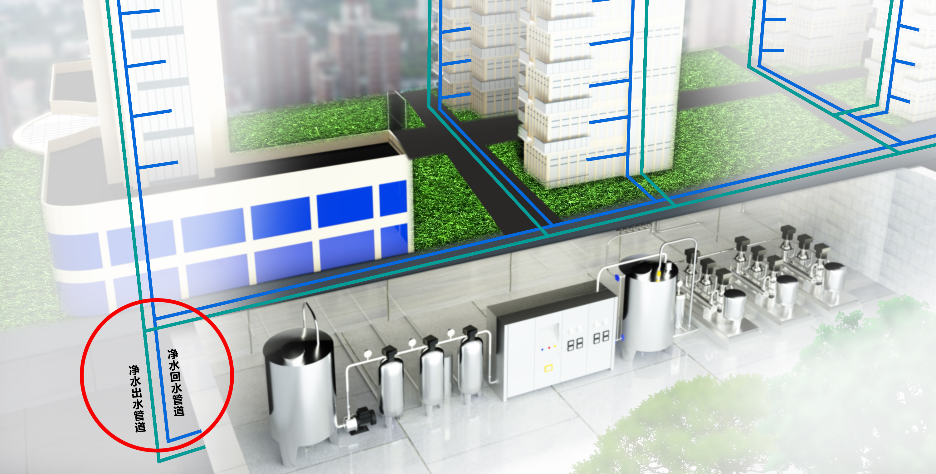 直飲水管道采用同程循環的方式,分為出水管道和回水管道。出水管道里未被使用的水會通過回水管道再次進入中央凈水機房,進行再次凈化、殺菌,這樣可以保證整個直飲水管道中的水都是循環活水。
